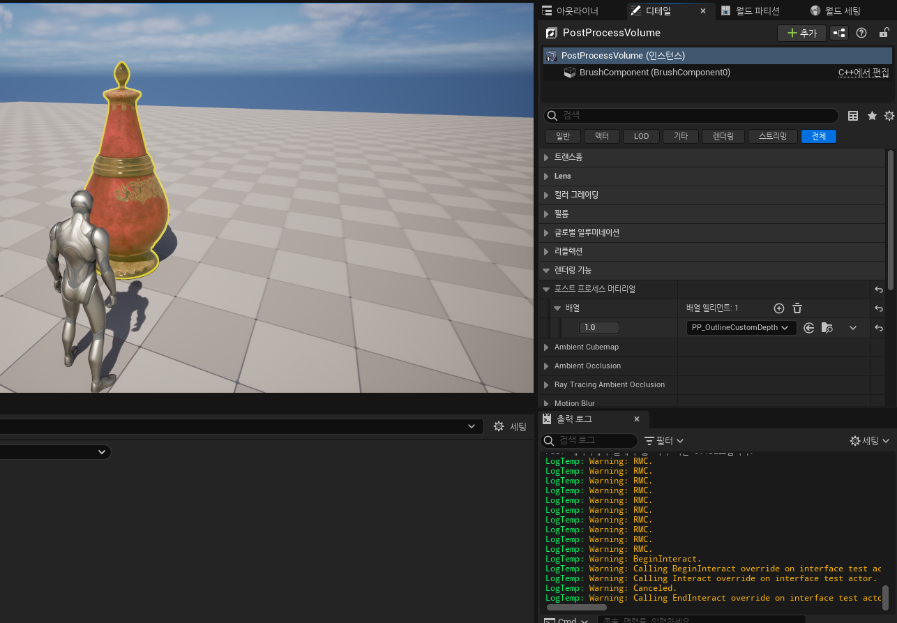 포스트 프로세스에서 아이템을 표시할 커스텀 머터리얼을 선택하고 클릭하여 로그를 확인한다 키보드 E를 눌렀을때와 뗐을때 나오는 로그를 확인