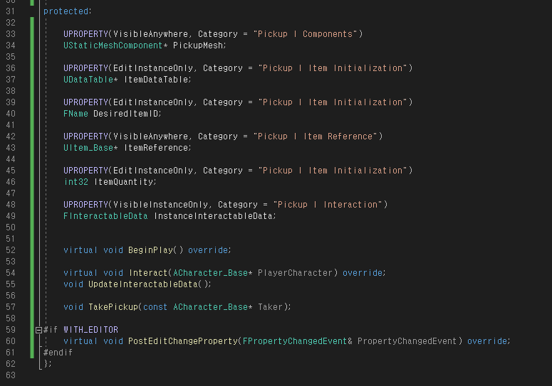 빈 Mesh와 ItemDataTable 그리고 테이블과 상호작용을 위한 ID, Item_Base 기반의 ItemReference, 수량, 데이터를 선언한다.