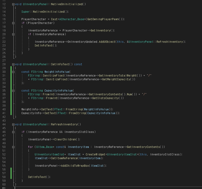 NativeOnInitialized에서 현재 플레이 캐릭터의 인벤토리를 가져와 델리게이트 설정해주었던 OnInventoryUpdated를 InventoryPanel의 RefreshInventory에 부착해준다.