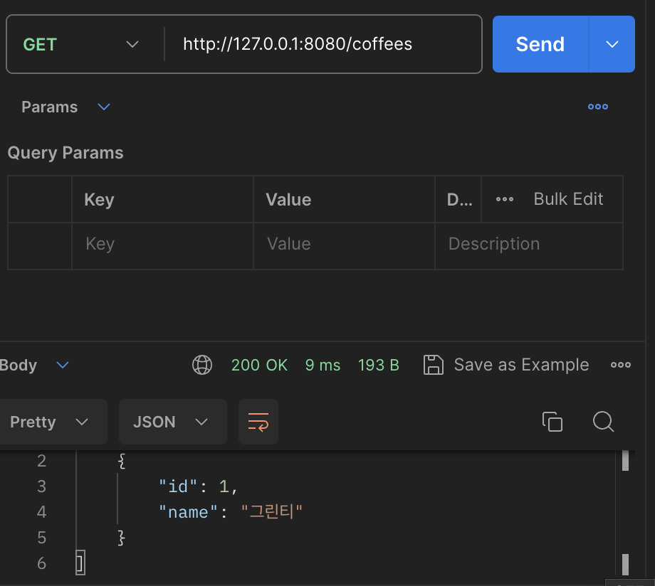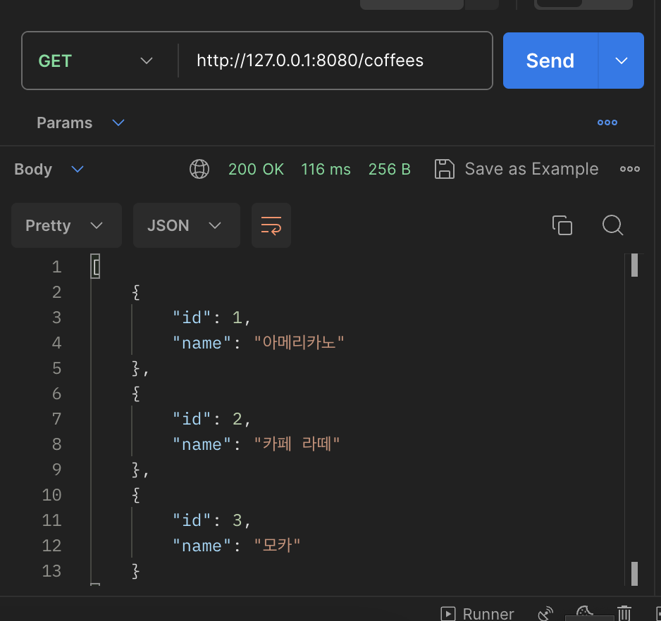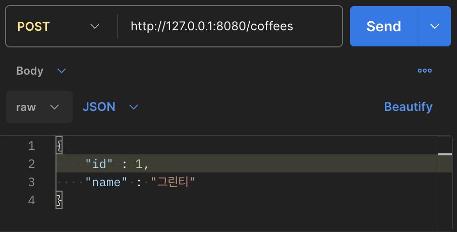 다음 예제에서는 컨트롤러에서 해당 레포지토리를 주입받아 로컬 변수인 coffee말고 h2 데이터베이스를 활용해 CRUD를 구현했습니다.