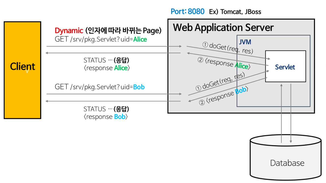 기존의 웹서버에서 정적인 응답값 밖에 반환을 하지 못했지만, 동적인 페이지를 응답할 필요가 있었고, 이러한 처리를 담당하는 것이 WAS