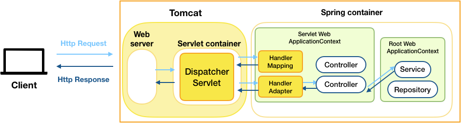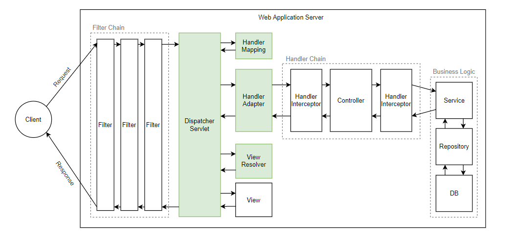 Handler Mapping을 통해 적절한 @Controller어노테이션을 찾아서 매핑Service, Repository를 찾아서 적절하게 처리서블릿콘테이너를 통해 비즈니스 로직을 분리하고 WAS에서 실행되도록 변경하기