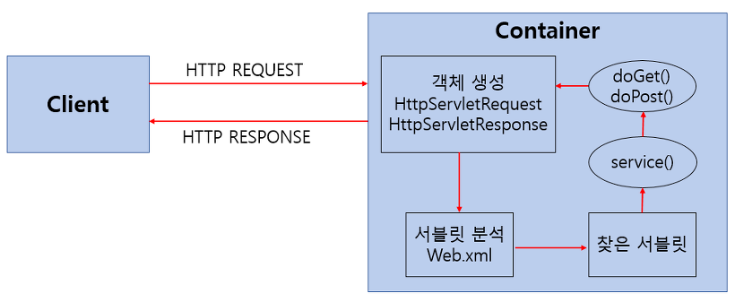 서블릿을 관리해주는 것이 서블릿 컨테이너(etc. 톰캣, 아파치 등)