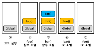 foo가 실행되면 foo의 실행 컨텍스트가 콜 스택에 쌓이고, 그 안에서 bar가 호출되면 bar의 실행 컨텍스트가 추가로 푸시된다.