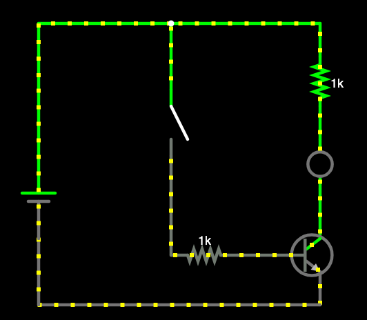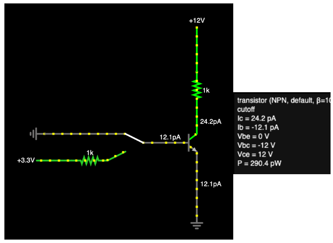 트랜지스터를 차단 모드로 놓고 싶다면 가장 쉬운 방법은 베이스를 접지시키는 거에요. 스위치를 누르면 접지돼서 트랜지스터로 전류가 흐르지 않아요. 트랜지스터를 켜려면 베이스 전압이 0.6V 한계 전압과 같거나 높아야 하거든요. 시뮬레이터가 친절하게 cut-off 라고 알려줍니다.