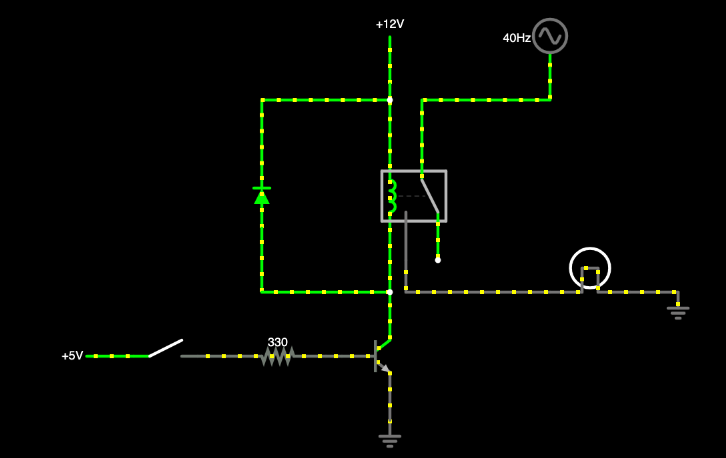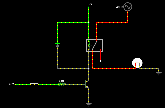 시뮬레이터에서 회로가 어떻게 보일지 보죠. 스위치를 통해 I/O핀과 트랜지스터 베이스를 연결합니다. NPN 트랜지스터와 릴레이, 230V 교류 전원공급, 전구를 연결해줍니다.