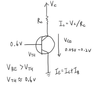 예를 들어, 베이스 +5V(입력), 컬렉터 +12V(VCC) 라면 이건 V_B = 5V, V_C = 12V 인걸까요? 그건 아닌거 같습니다. 이거는 전원 전압이고, 위에서 말하는 건 노드 전압입니다. 예를 들어, 컬렉터에 12V 입력전압을 걸어줬다면 Rc 저항으로 전압 강하가 된 다음 남은 전압이 V_C가 되겠네요. 여기서는 V_C가 V_CE와 같은 0.05V - 0.2V 값을 갖는거고요.