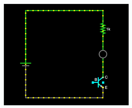 그러니까 이 작은 전류를 흐르게 하면 트랜지스터가 훨씬 큰 전류를 컬렉터에서 이미터로 흐르게 하는 거죠. 트랜지스터 위에 마우스를 올려 보면 컬렉터 전류가 베이스 전류보다 훨씬 큰 걸 알 수 있습니다.