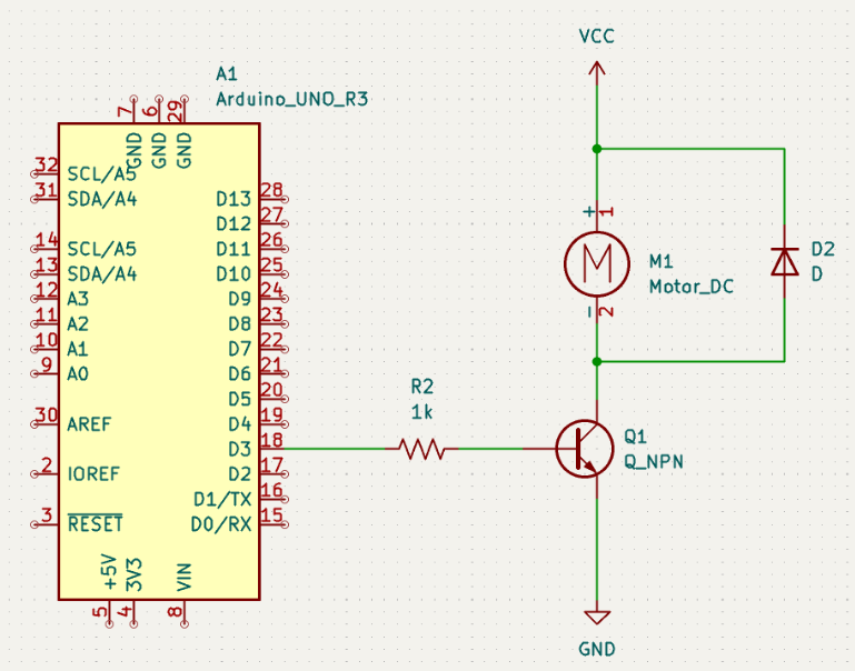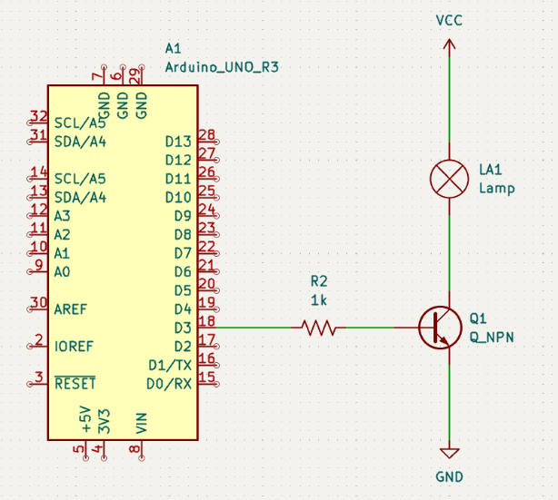 사람들이 트랜지스터를 마이크로컨트롤러와 함께 사용하는 주요 이유 중 하나는 I/O 핀이 상대적으로 적은 양의 전류만 공급하기 때문이죠. I/O핀은 5볼트 전압에서 최대 20mA까지 출력할 수 있어요. 높은 출력을 내기엔 부족하죠.