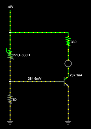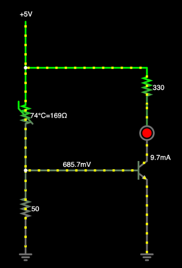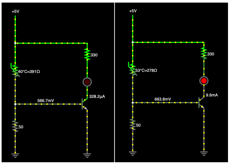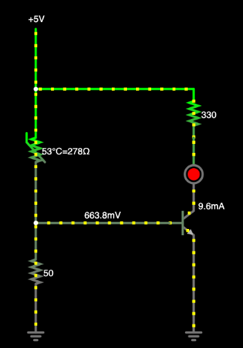 이제 온도가 올라가면 Thermistor의 저항이 감소하고 전압 분리기의 출력이 증가합니다. 온도가 올라갈수록 베이스 전압도 올라갑니다. 그러면 트랜지스터를 켤 수 있을 거에요. 그러면 LED도 켜지죠.