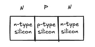 트랜지스터는 세 개 층의 다이오드 같은 거에요. 그 결과 트랜지스터는 두 곳이 아닌 세 군데로 나뉘죠. 각 지역 간의 인터페이스가 P와 접합부를 형성합니다. (NPN인 경우)