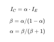 이렇게 되고요. 여기다가 α = I_C/I_E 를 대입시키면 "β = α / (1 - α)" 이라는 공식이 나오게 되는거죠. 역으로, α = β / (β + 1) 도 유도할 수 있습니다. 예를 들어볼까요? 베타가 100이면 알파는 대략 0.99 라는 뜻 입니다. 컬렉터 전류가 100mA라면 이미터 전류는 101mA 인거에요.