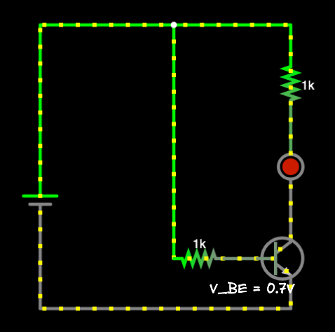 트랜지스터의 기본은 다이오드처럼 작동해요. 저항기를 직렬로 연결하고 배터리에 연결하면 0.7V는 이미터에서 떨어지고 나머지 전압은 저항기에서 떨어집니다. 자동으로 V_BE = 0.7V가 나오죠.