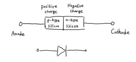 이제 트랜지스터 내부를 자세히 살펴보죠. 지난 시간에 배웠듯이 다이오드는 가장 단순한 반도체입니다. PN 접합이 만들어진 거죠. 두 개의 반도체가 합쳐진 결합체입니다. 전자가 몇 개 없는 곳에는 양전하가 있고, 다른 곳에는 전자가 몇 개 더 있어요. 그게 음전하죠.