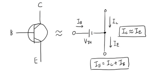 또 하나 중요한 사실은 컬렉터와 이미터 사이에 완벽한 전도율이 없다는 겁니다. 이는 트랜지스터가 거의 완벽한 단락처럼 동작하지만 실제로는 약간의 저항이 있어서 미세한 전압 강하가 발생한다는 의미입니다. 노드 사이에 약간의 전압이 떨어질 거에요.