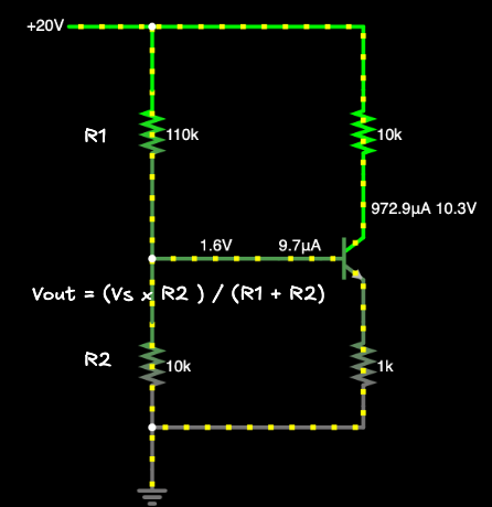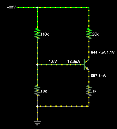 이제 시뮬레티어 없이 회로의 전압과 전류를 계산해봅시다. 우선 베이스 전압을 계산해 보죠. 쉽습니다. 트랜지스터의 베이스는 전압 분리 회로에 연결되어 있어요. 이 값을 계산해보면 출력 전압이 1.6V 정도 나옵니다.