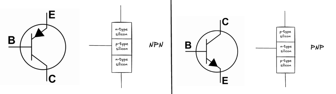 이 그림은 두 가지 공통 트랜지스터의 구조와 개략도 기호를 보여줍니다. 트랜지스터를 만드는 방법은 P 혹은 N 유형의 반도체가 두 종류의 전도체 사이에 끼어 있는거에요. 그 결과 NPN 트랜지스터와 PNP 트랜지스터가 있게 되죠.