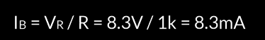 컬렉터 전류는 어떨까요? 트랜지스터가 합선 회로 역할을 하기 때문에 옴의 법칙을 이용해 간단하게 계산할 수 있습니다. 여기 보이는 것처럼 회로가 있다면 이 전원 공급 전압과 저항기가 트랜지스터를 통과하는 전류를 결정할 거에요. 전원 공급 볼트를 저항기의 저항으로 나누면 전류를 구할 수 있어요.