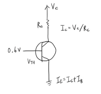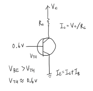 이제 두 조건으로 돌아가보죠. 베이스-이미터 접합부는 다이오드처럼 보입니다. 즉, 베이스-이미터 전압이 포화도에 도달하려면 임계 전압을 넘어야 합니다. 트랜지스터에 따라 임계값은 다르고 더 나아가 온도에 따라 다릅니다. 상온의 트랜지스터들은 수치가 0.6-0.7V 정도라고 보면 됩니다.