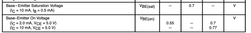 데이터시트를 보면 컬렉터 전류가 클수록 V_BE가 약간 증가하는데(2mA일 때 0.55~0.7V, 10mA일 때 최대 0.77V), 이는 전류가 많이 흐를수록 접합 전압이 조금 올라가는 다이오드 특성 때문이며, 회로 계산 시 보통 0.7V로 근사합니다.