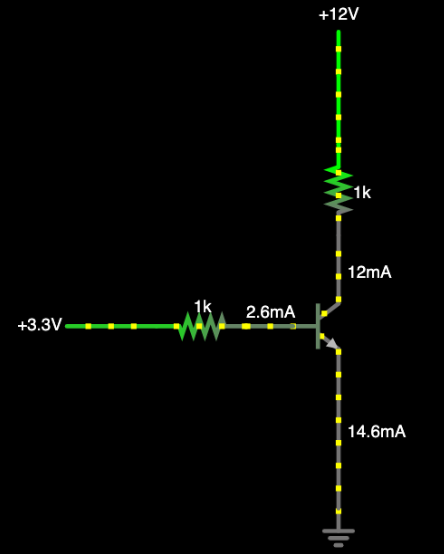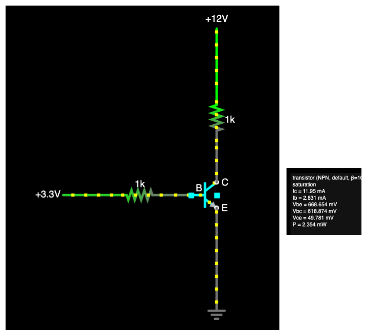 트랜지스터 포화 모드는 단락 회로 역할을 해서 트랜지스터를 통과하는 전류는 컬렉터가 공급하는 전압을 저항으로 나눠서 계산하면 됩니다. 12V / 1k 옴 = 12mA 인거죠. 사실 컬렉터와 이미터 사이에 약간에 미세한 저항이 합쳐져서 미세한 전압 강하가 일어나긴 하지만 저항이 아주 작고 거의 중요하지 않아서 방정식에서 빼도 됩니다.