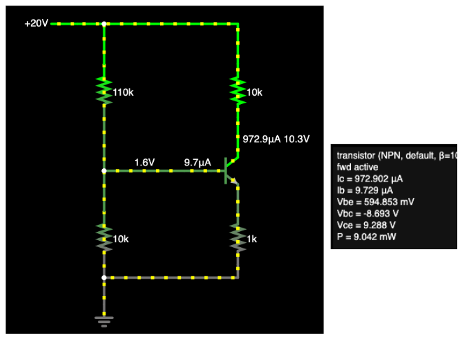 여기서 트랜지스터의 β는 100 이라고 해봅시다. (시뮬레이터에서 원하는 값으로 수정할 수 있어요). 이 값을 방정식에 연결하면 베이스 전류 IB = IE / (1 + β) = 982μA / 101 = 9.7μA 가 됩니다.