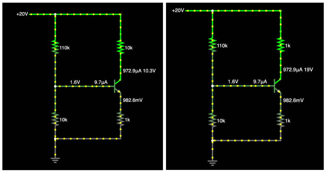 아, 그리고 컬렉터 전압은 V_C = VCC - (I_C × R_C) 공식으로 계산할 수 있습니다. 20V 전원에서 시작해서 컬렉터 저항(10kΩ)에서의 전압 강하를 빼면 됩니다. 여기서는 V_C = 20V - (972.9μA × 10kΩ) = 20V - 9.729V = 10.271V ≈ 10.3V 가 됩니다.