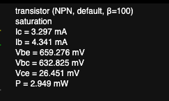 트랜지스터에 마우스를 대면 베이스-이미터 전압(Vbe)이 얼마인지 알 수 있어요. 0.6V~0.7V 인걸 알 수 있죠.