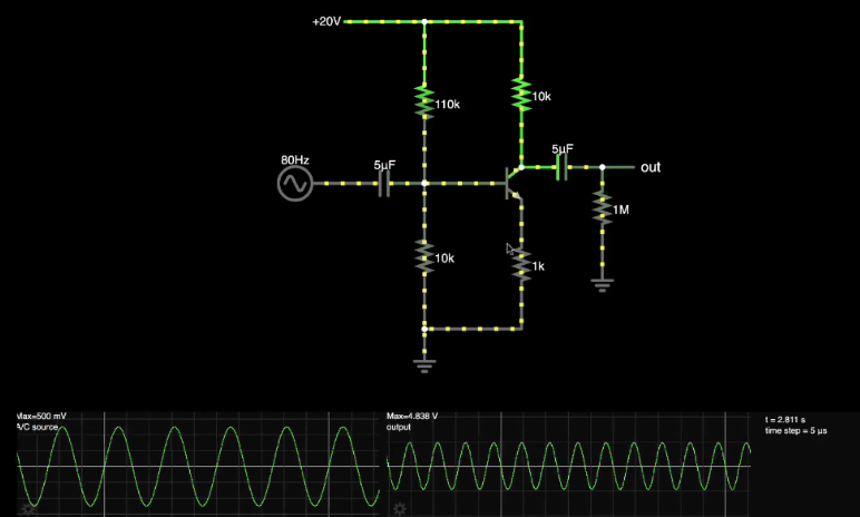 이처럼 액티브 모드는 작은 교류 신호를 증폭하는 데 사용하죠. 아래 회로는 교류 신호를 10배로 증폭시킵니다. 트랜지스터가 액티브 모드로 작동한다는 걸 보여드리기 위해 소개했습니다. 나중에 이런 회로를 어떻게 구성하는지 자세히 분석할 겁니다.
