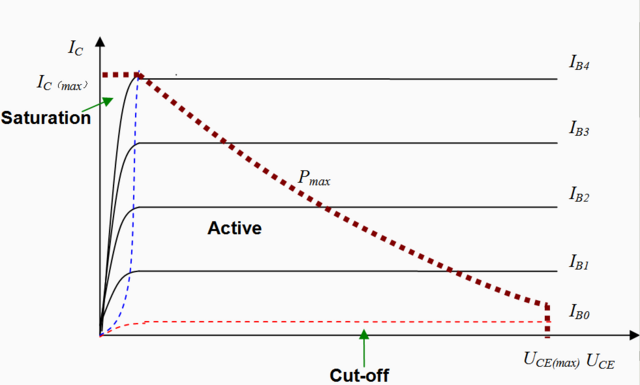 참고로, Ic(max)는 트랜지스터가 견딜 수 있는 최대 컬렉터 전류, U_CE(max)는 트랜지스터가 파괴되지 않고 견딜 수 있는 최대 전압, Pmax(붉은 대각선 점선)은 최대 소비 전력 곡선을 나타냅니다. 트랜지스터에서 발생하는 열이 한계를 넘지 않도록, 동작점(Q-point)은 반드시 이 점선 아래쪽에 위치해야 합니다. (P = U_CE x Ic)