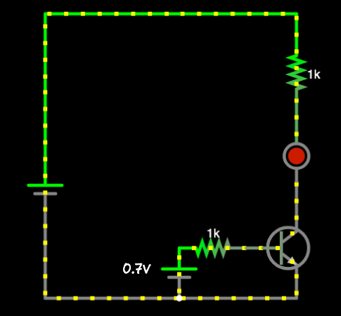 트랜지스터를 켜려면 전압이 0.7V 정도 필요해요. 베이스와 이미터 사이의 0.7V 배터리를 연결하면 트랜지스터가 켜질거에요. 중간에 1kΩ-10kΩ 저항을 넣어야 베이스 전류를 적정 수준(1-10mA)으로 제한하고 안전하게 동작합니다.