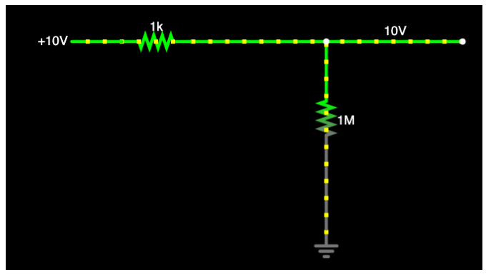 1M를 10k로 낮춰보도록 하겠습니다. 전압 분배 법칙 (V_out = V_in x Z2 / (Z1 + Z)) 에 의해 9.1V가 나옵니다.