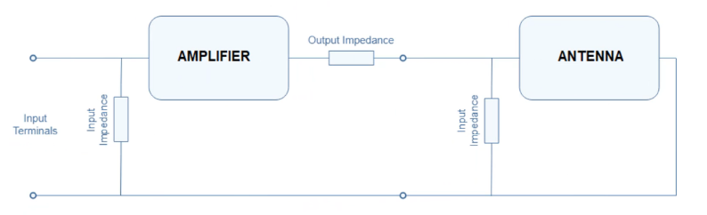 안테나의 입력 임피던스가 50Ω이므로, 신호원의 출력 임피던스도 50Ω으로 맞추면 "최대 전력 전송 정리"에 따라 안테나로 전달되는 전력이 최대화됩니다.