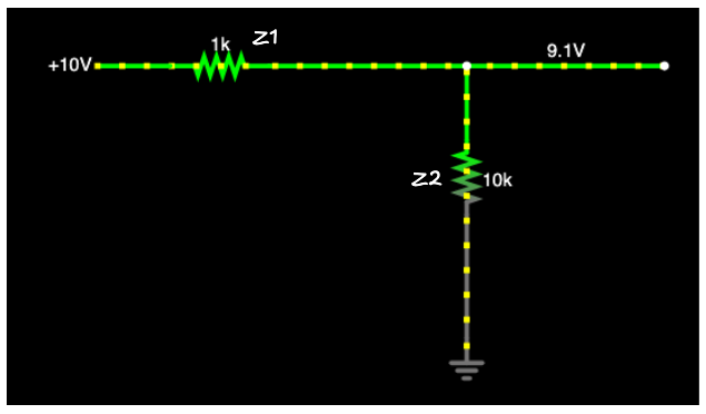 출력 임피던스가 다음 회로의 입력 임피던스보다 충분히 낮기 때문에 신호가 약화되지 않고 전달되는 것을 볼 수 있습니다. 1옴 대신 200옴 이라면 8.3V로 줄어듭니다. 전압 분배 방정식을 이용하면 전압이 떨어지는 이유를 알 수 있습니다.