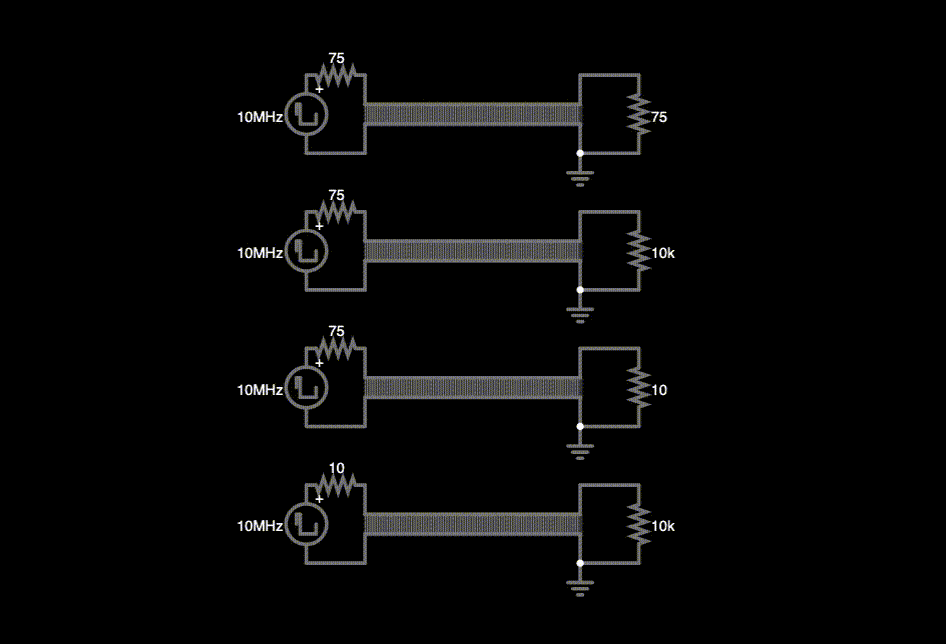 시뮬레이션은 75Ω 동축케이블에 서로 다른 종단 저항을 연결하여 임피던스 매칭의 중요성을 보여줍니다. 사각파 신호를 5초마다 전송합니다. 케이블 임피던스(75Ω)와 부하 저항이 일치하지 않으면 "반사(Reflection)" 현상이 발생하며, 부하가 모든 에너지를 흡수하지 못하고 일부가 신호원으로 되돌아갑니다.