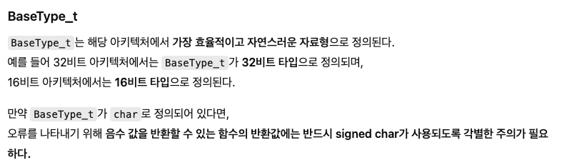 예를 들어, ARM Cortex-Mx 프로세서와 같은 32비트 아키텍처 기반 프로세서를 사용하는 경우, BaseType_t는 32비트 C 데이터 타입의 타입 정의가 될 것입니다. 16비트 아키텍처에서 BaseType_t는 16비트 타입으로 정의될 것입니다.