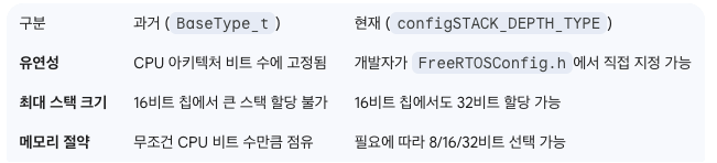 마찬가지로 8비트 아키텍처의 경우 BaseType_t는 8비트 타입으로 정의될 것입니다. 이것은 uint8_t StackDepth 가 되는 거죠. 근데 이것은 너무 제한적입니다.