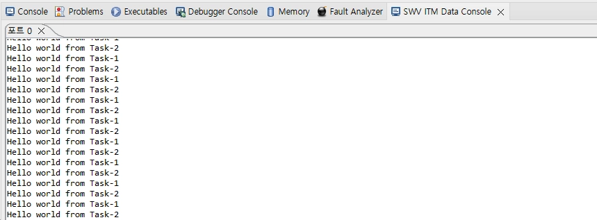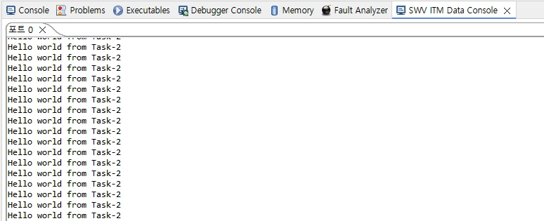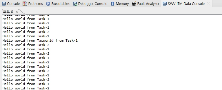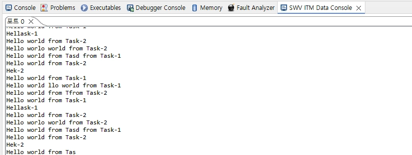 이걸 찾아보니까 저는 Serial Wire Viewer(SWV)를 사용해서 디버깅 모드로 출력 결과를 보고 있는데 printf 를 사용하면 내부적으로는 FIFO 버퍼를 사용하면서 ITM 버퍼에 데이터가 채워지는 도중에 Task가 전환이 될 수 있다고 하네요.
