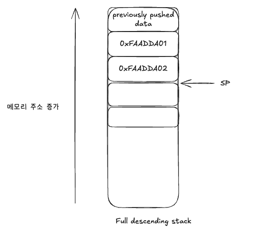 우리의 ARM Cortex-Mx 마이크로컨트롤러(M0, M3, M4, M7 등)에서는 실제로 스택이 32비트(4바이트) 폭입니다. 따라서 ARM Cortex-Mx 프로세서에서 스택 연산 모델은 full descending stack 입니다. 즉, 스택 포인터 SP는 높은 메모리 주소에서 시작하여 push가 발생할 때마다 낮은 메모리 주소로 이동합니다.