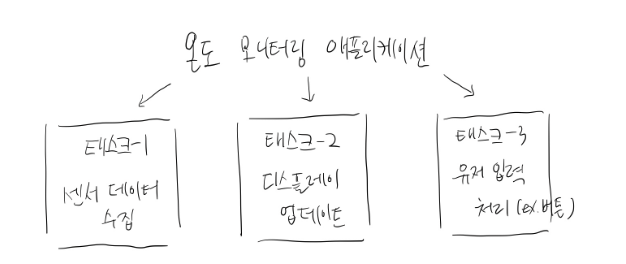 온도 모니터링 애플리케이션을 예로 들어보겠습니다. 이 애플리케이션은 세 개의 태스크를 사용하여 구현할 수 있습니다. Task1은 센서 데이터를 수집하고, Task2는 디스플레이를 업데이트하며, Task3은 항상 사용자 입력을 처리하기 위해 대기합니다.