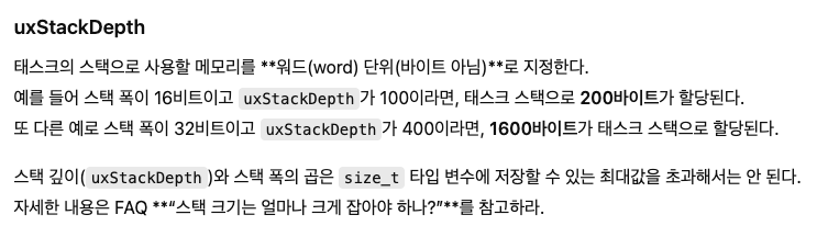 FreeRTOS API를 이해하는 데 매우 유용할 API 레퍼런스 문서 입니다. 열어보면 이 웹 페이지에서 이 API에 대해 더 읽을 수 있습니다. 이제 여기서 이 Stack Depth 매개변수에 대해 더 이해해봅시다.