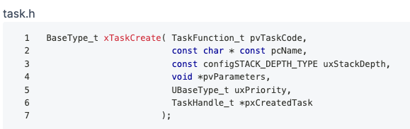 이 API를 애플리케이션에서 사용하여 새로운 FreeRTOS 태스크를 생성할 수 있으며 여기에 몇 가지 매개변수를 제공해야 합니다.