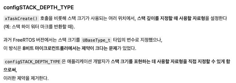구버전 FreeRTOS의 경우 스택 깊이의 타입을 언급하는 이 매크로를 찾을 수 없다는 점에 유의하세요. 구버전 FreeRTOS는 UBaseType_t 타입의 변수를 사용하여 스택 크기를 지정했지만, 8비트 마이크로컨트롤러에서는 너무 제한적이라는 것이 발견되었습니다. 그래서 그 제한을 제거하기 위해 이 config 항목이 제공됩니다.
