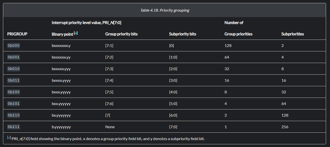 Cortex-M3 Devices Generic User Guide 문서를 보면 AIRCR 레지스터에 대한 설명이 있는데 여기서 우선순위 그룹을 설정하는 비트가 있다. [10:8] PRIGROUP