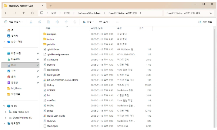 다운받은 커널 압축파일을 Software&Toolchain 에다가 압축해제하겠습니다. 이 디렉토리에서 FreeRTOS 커널의 소스 코드를 볼 수 있습니다.