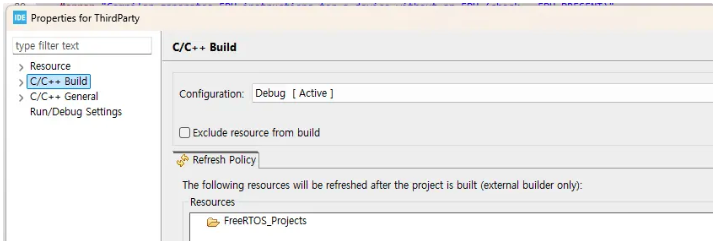 이제, 이것(ThirdParty)을 마우스 오른쪽 버튼으로 클릭하고 Properties로 이동한 다음 C/C++ Build로 이동하여 "exclude resource from build" 옵션이 체크 해제되어 있는지 확인합니다.