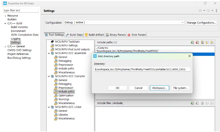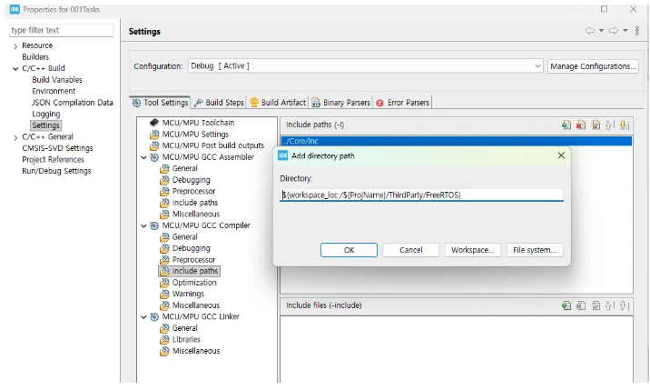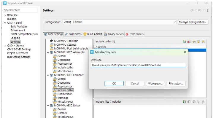 이제 컴파일러에 대한 include 경로를 추가해야 합니다. Add를 클릭하고 Workspace를 클릭하겠습니다. FreeRTOS 폴더안에 include 폴더를 선택해서 Add 하세요. 여기에 추가되었습니다.