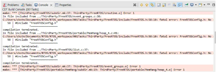 이제 프로젝트를 다시 빌드해봅시다. 이제 FreeRTOS 관련 헤더 파일 문제가 대부분 해결된 것을 볼 수 있습니다. 하지만 또 다른 오류가 발생했습니다. 바로 FreeRTOSConfig.h입니다.