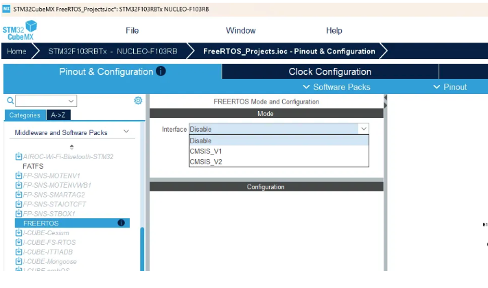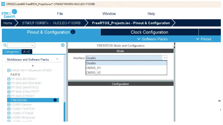 STM32 프로젝트가 이미 있다고 가정해봅시다. STM32CubeMX을 열어봅니다. 그런 다음 Pinout and Configuration 섹션으로 이동합니다. 여기서 이 Middleware and Software를 엽니다. 여기 FreeRTOS 옵션이 있습니다.