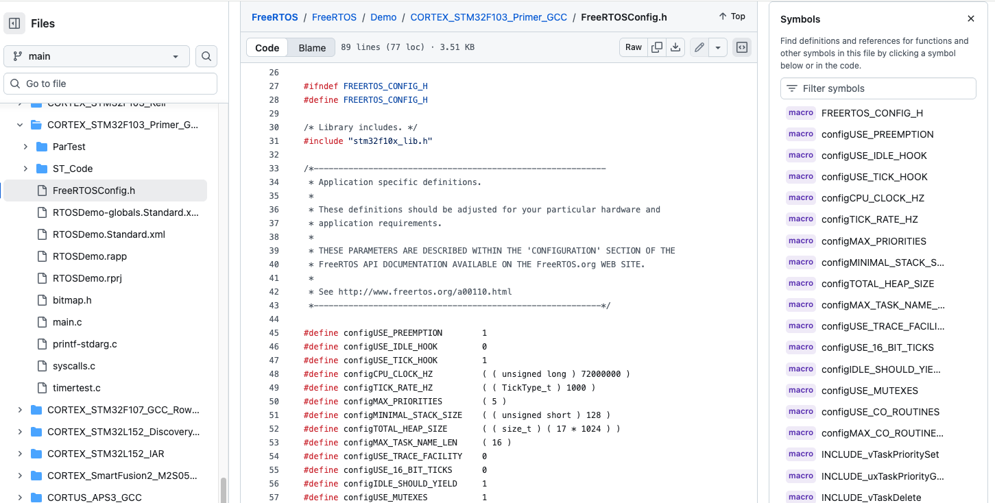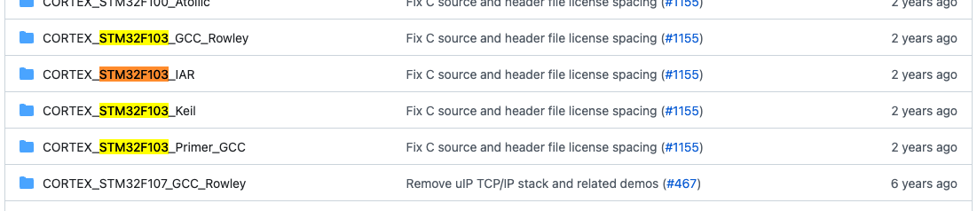 이것들은 FreeRTOS에서 다양한 마이크로컨트롤러를 위해 제공하는 데모 애플리케이션입니다. 이 경로에서 마이크로컨트롤러를 검색하세요. 제 마이크로컨트롤러 "STM32F103"을 검색해봅니다.